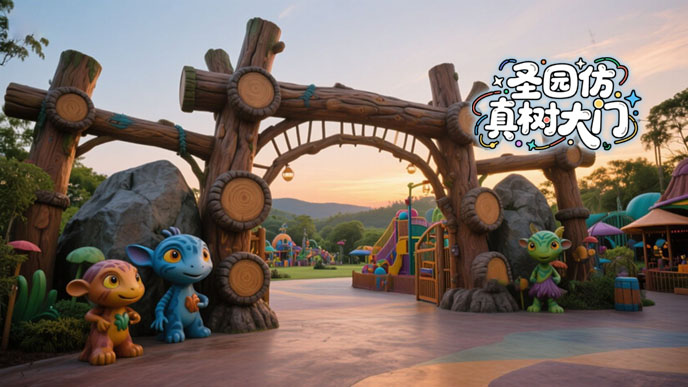 對比來看,設計圖雖保留了 “古木” 的意境,但更偏重于視覺美感;修改后的仿真樹大門實景則在安全與實用上實現(xiàn)了平衡 —— 加粗的樹根讓大門更顯穩(wěn)固,主要展現(xiàn)樹干骨架美解決了戶外仿真樹葉維護難題,調(diào)整后的燈光既保留了氛圍感,又避免了視覺雜亂。這種從 “理想設計” 到 “實景優(yōu)化” 的轉變,讓仿真樹大門既守住了設計初心,又更貼合園區(qū)的實際使用需求。